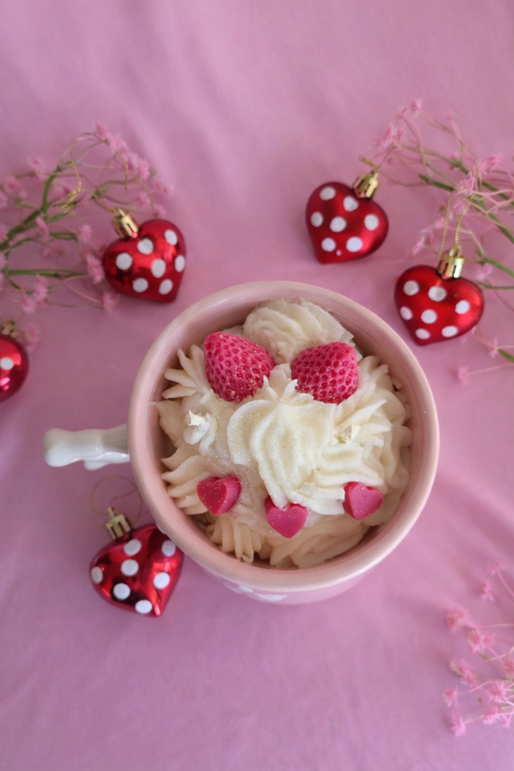 🍓Vela "Strawberry Latte" en Taza Coquette (11 oz): Una vela tipo postre con un diseño artesanal de crema, fresas y corazones. Disfruta su aroma a fresas frescas, cristales de azúcar y vainilla. Lo mejor: la taza de cerámica es reutilizable para tus bebidas favoritas el resto del año.