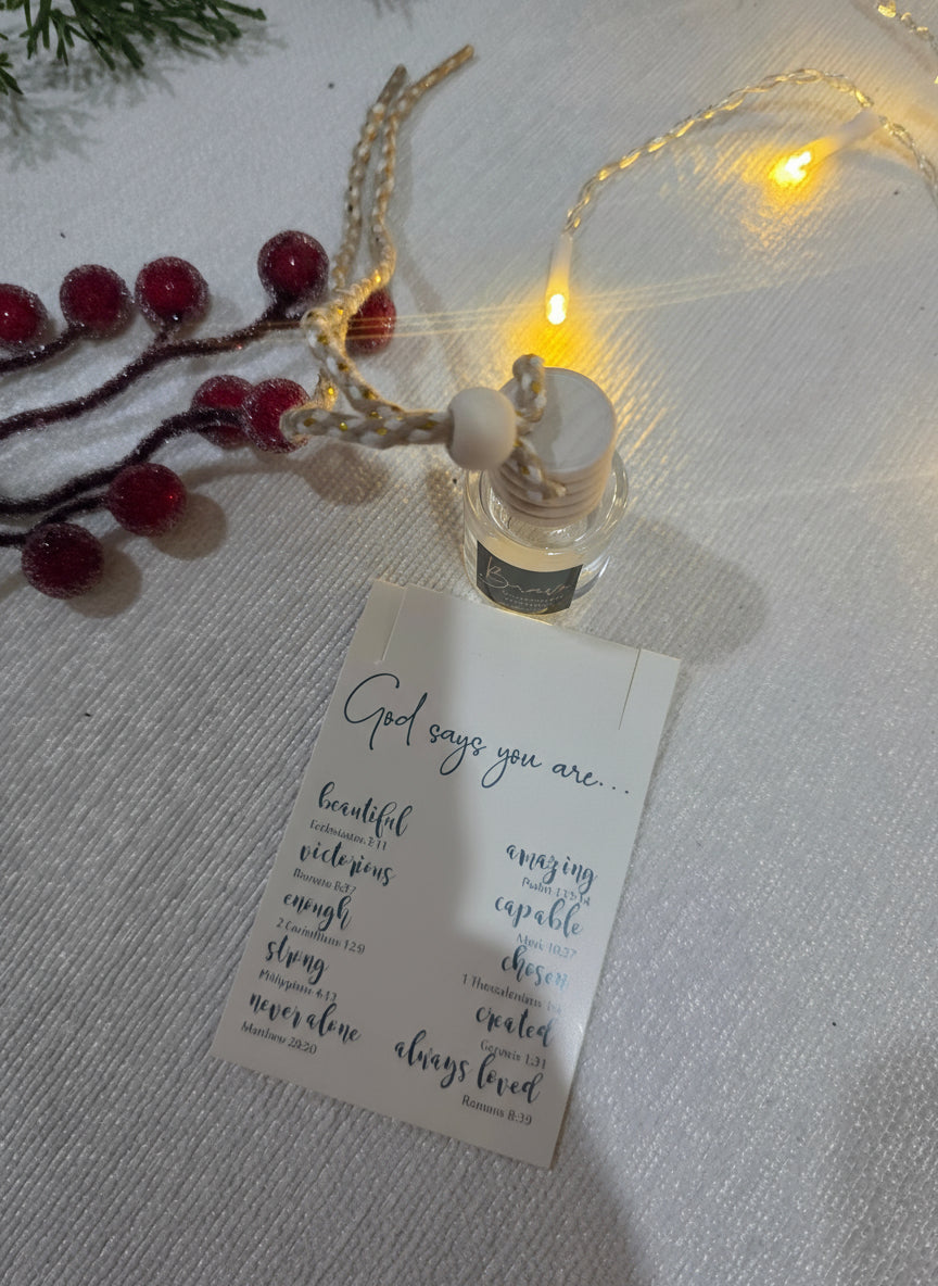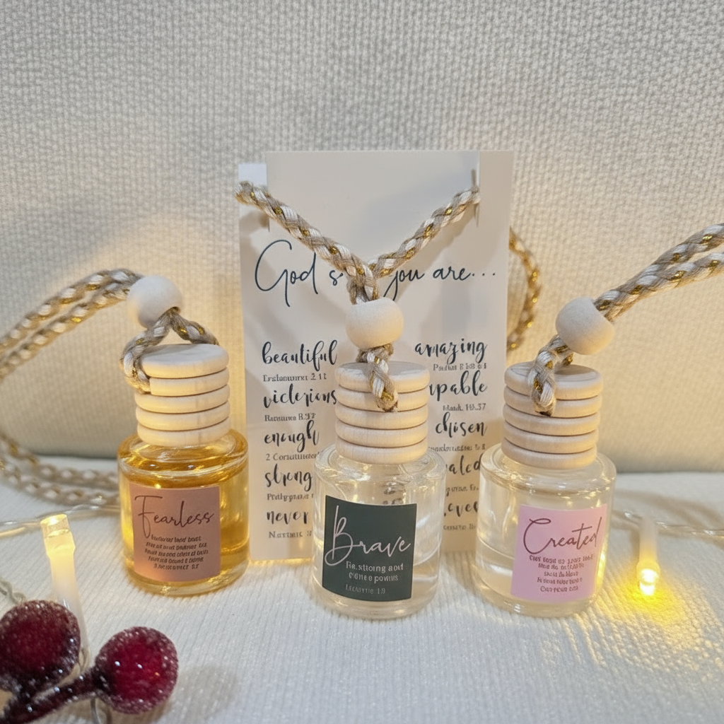 Nuestros difusores de auto combinan fragancias artesanales con tarjetas motivacionales y etiquetas inspiradas en versículos y afirmaciones, para llenar tu día de calma, propósito y esperanza.